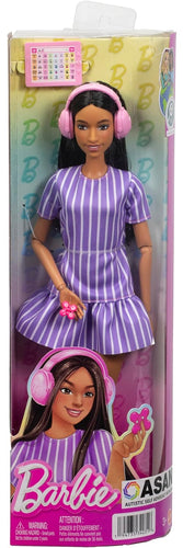Barbie Fashionistas Doll #245, Autistic Doll Wearing Purple Striped Dress with Accessories Like Fidget Spinner, Tablet and Headphones