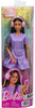 Barbie doll wears a lavender and white pinstriped dress with a relaxed, comfortable fit. The ruffle hem adds an extra pop of personality to her look!