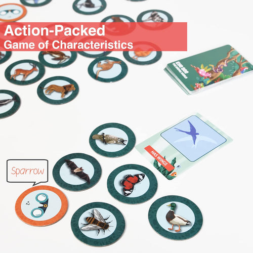 A Spot It Card Game that is easy to learn and play- Place all the animal tokens face up. Open a characteristic card and rush to grab tokens that match the card category. Player with maximum tokens wins the card. Be the first one to win 5 cards