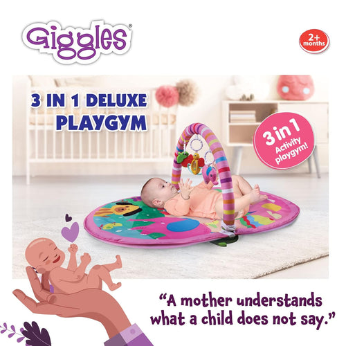Funskool Giggles - Deluxe Play Gym, Pink Colour Activity Playgym, 3 in 1 Modes of Play, with Arch and 3 Toys, Easy to Clean and wash, for 2 Month + Upto 6 Months.