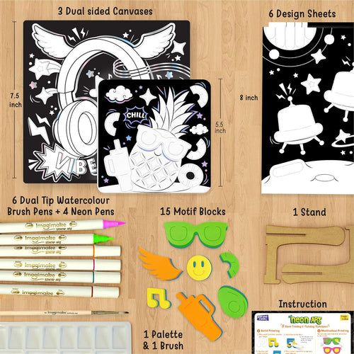 Imagimake DIY Neon Art Kit |Painting & Coloring Kit with Neon Brush Pens & Stamps| Mess Free Art & Craft kit for Kids 8-12 | Gift for Girls & Boys Ages 8,9,10,11,12 (UV Light Not Included)
