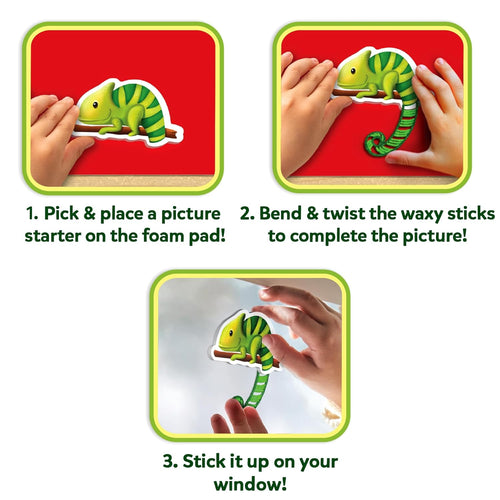 CREATIVE WINDOW ART!: This mess-free, fun, and easy activity encourages creativity and artistic exploration! Kids can use 100 colourful, bendy, twisty waxy sticks to create 15 amazing animal pictures!