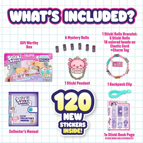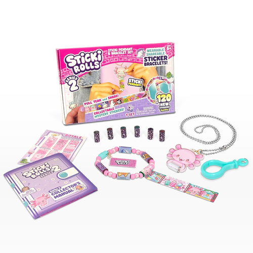 INCLUDES: 1 Sticki Rolls Bracelet, 120 Stickers (11 Sticki Rolls), 18 coloured Beads, 1 Elastic Cord with Clasps, 1 Charm Tag, 1 Sticki (Rex & Jojo) Pendant, 1 Backpack Clip, 1 Sticki Book Page, and 1 Collector’s Manual.